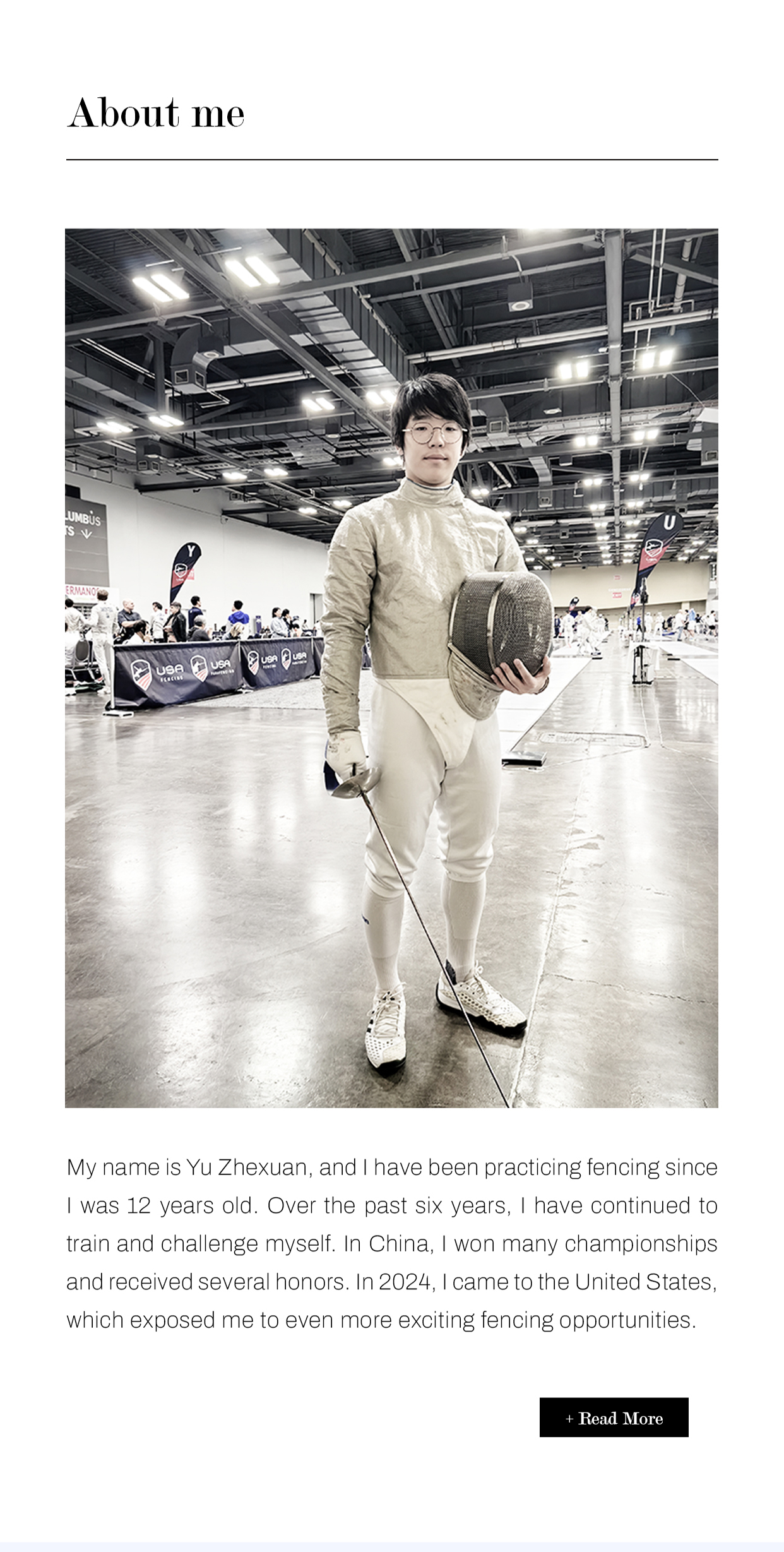 My name is Yu Zhexuan, and I have been practicing fencing since I was 12 years old. Over the past six years, I have continued to train and challenge myself. In China, I won many championships and received several honors. In 2024, I came to the United States, which exposed me to even more exciting fencing opportunities.